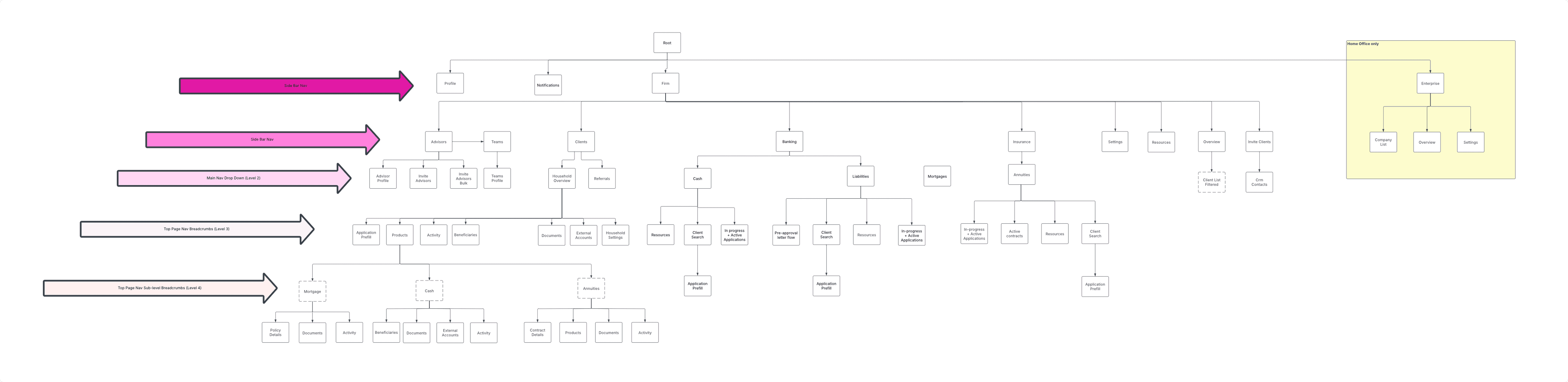 As phase 1 of the Home Office roadmap, we shipped a new side navigation system, standardized product landing-page structure, and a navigation framework to clarify when to use primary vs. secondary navigation across deeper product areas. V1 intentionally focused on a low-disruption migration to preserve existing advisor workflows while laying the foundation for future expansion.