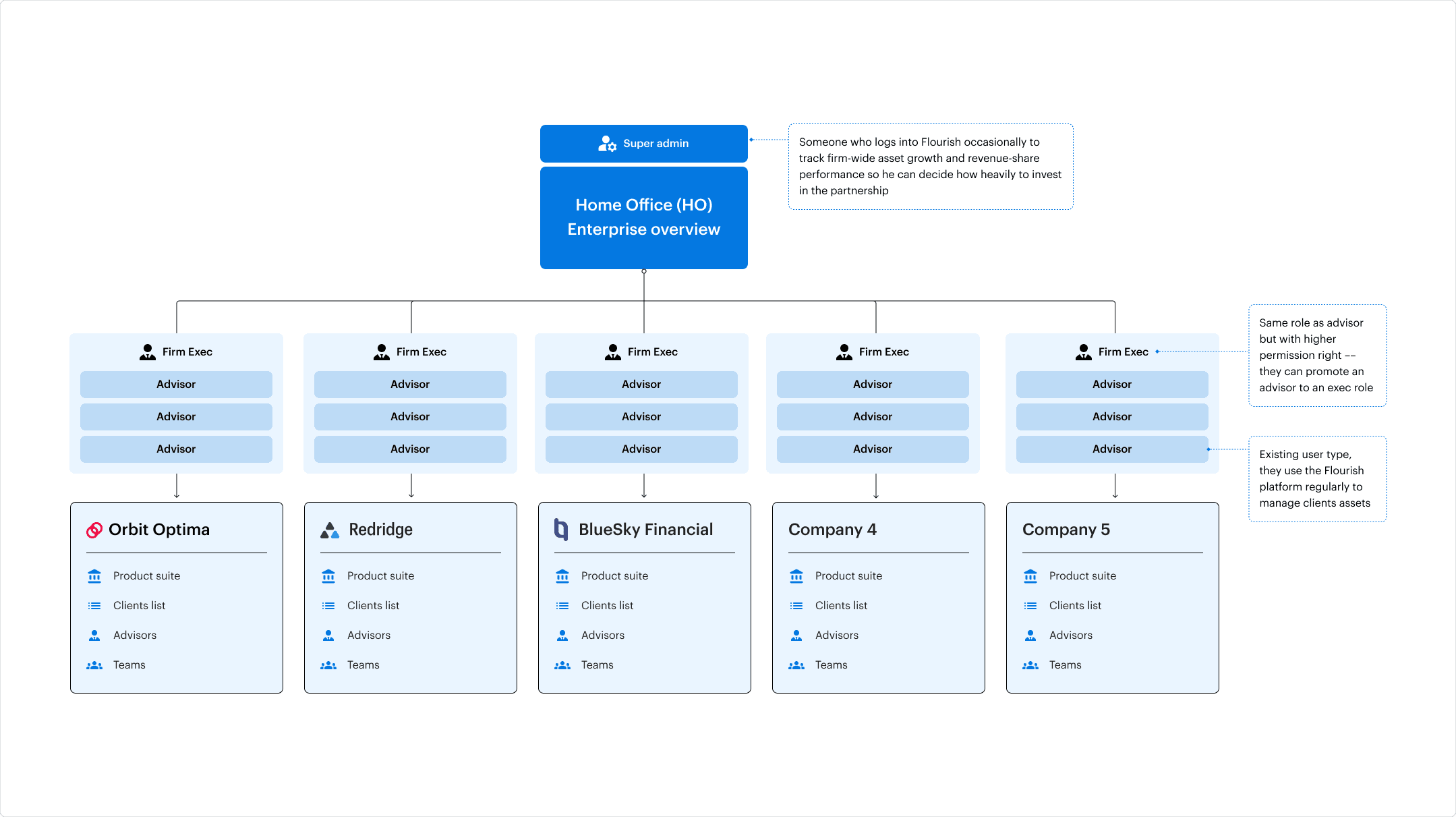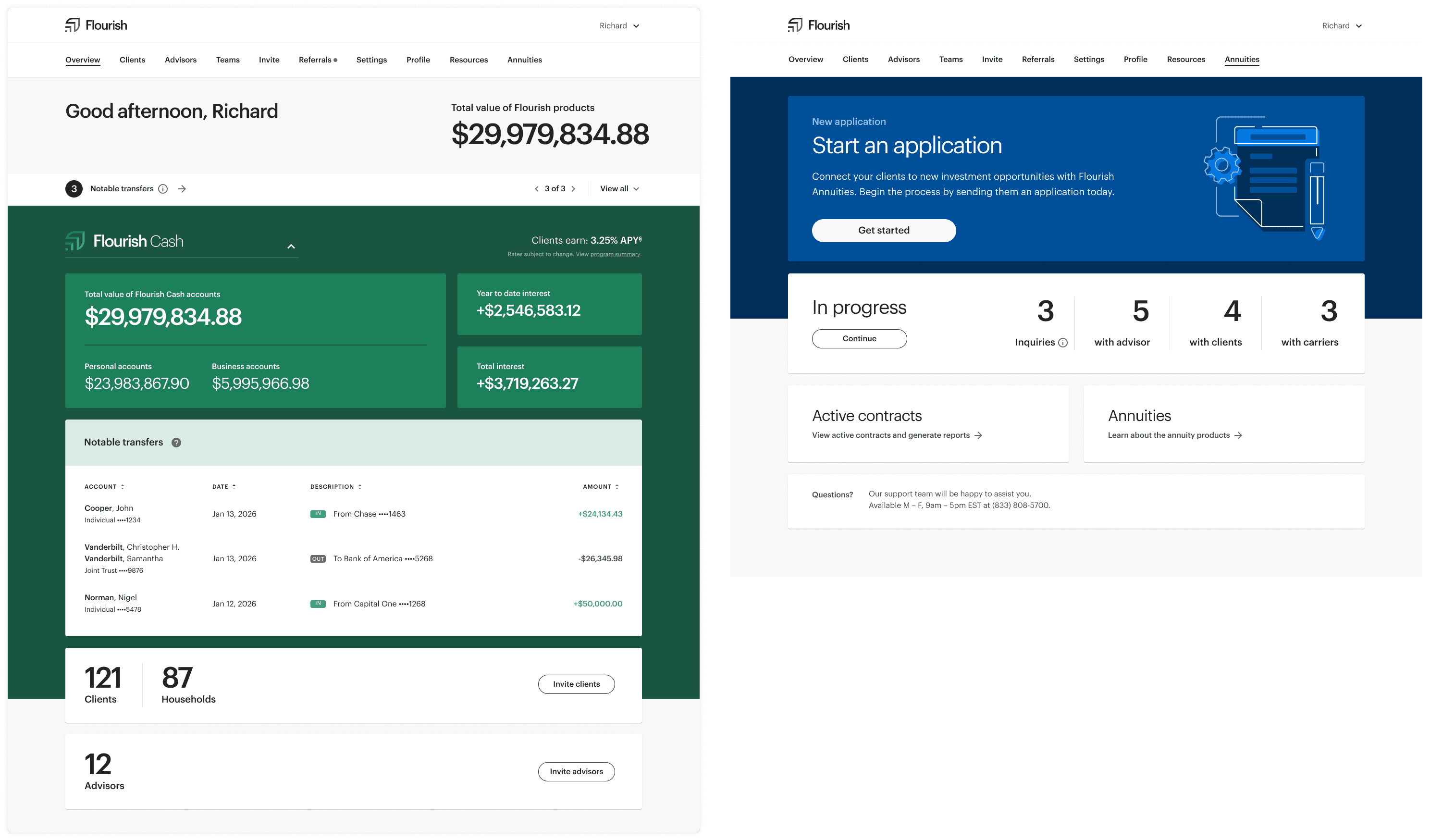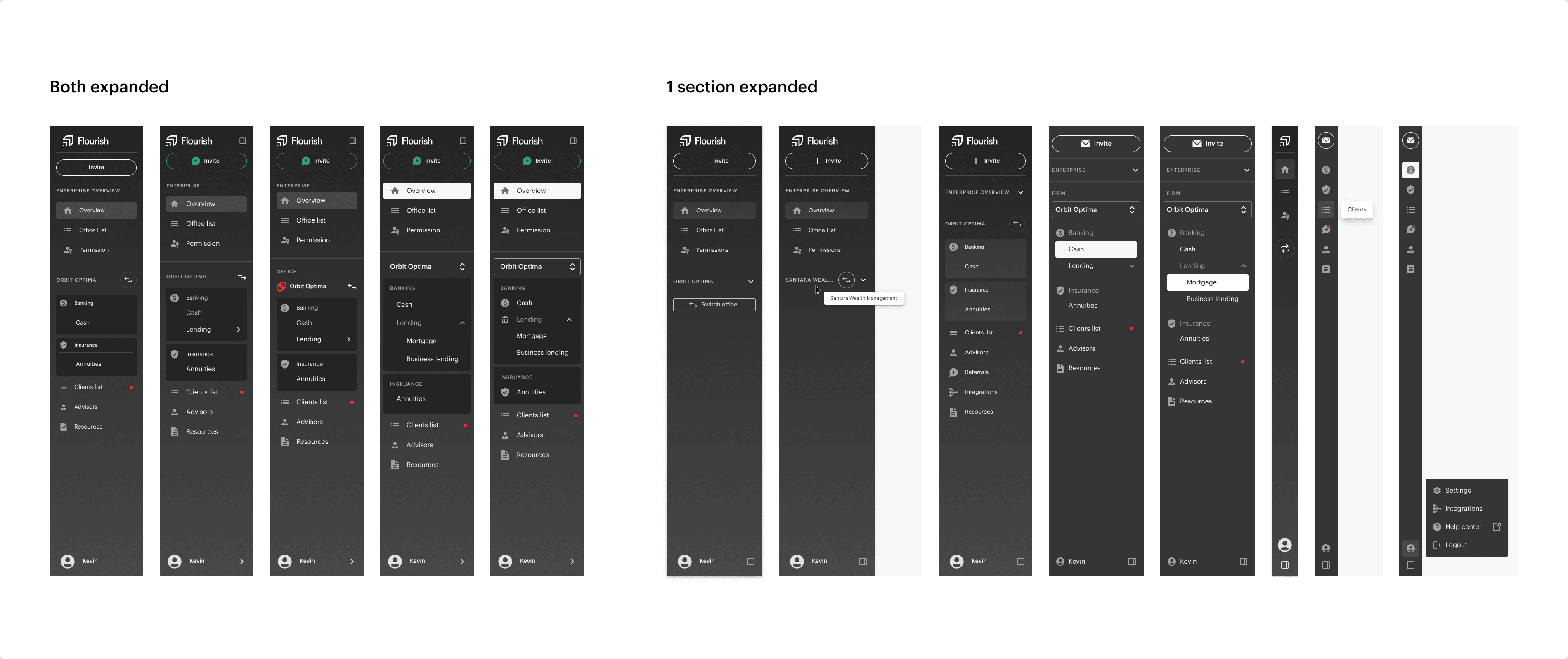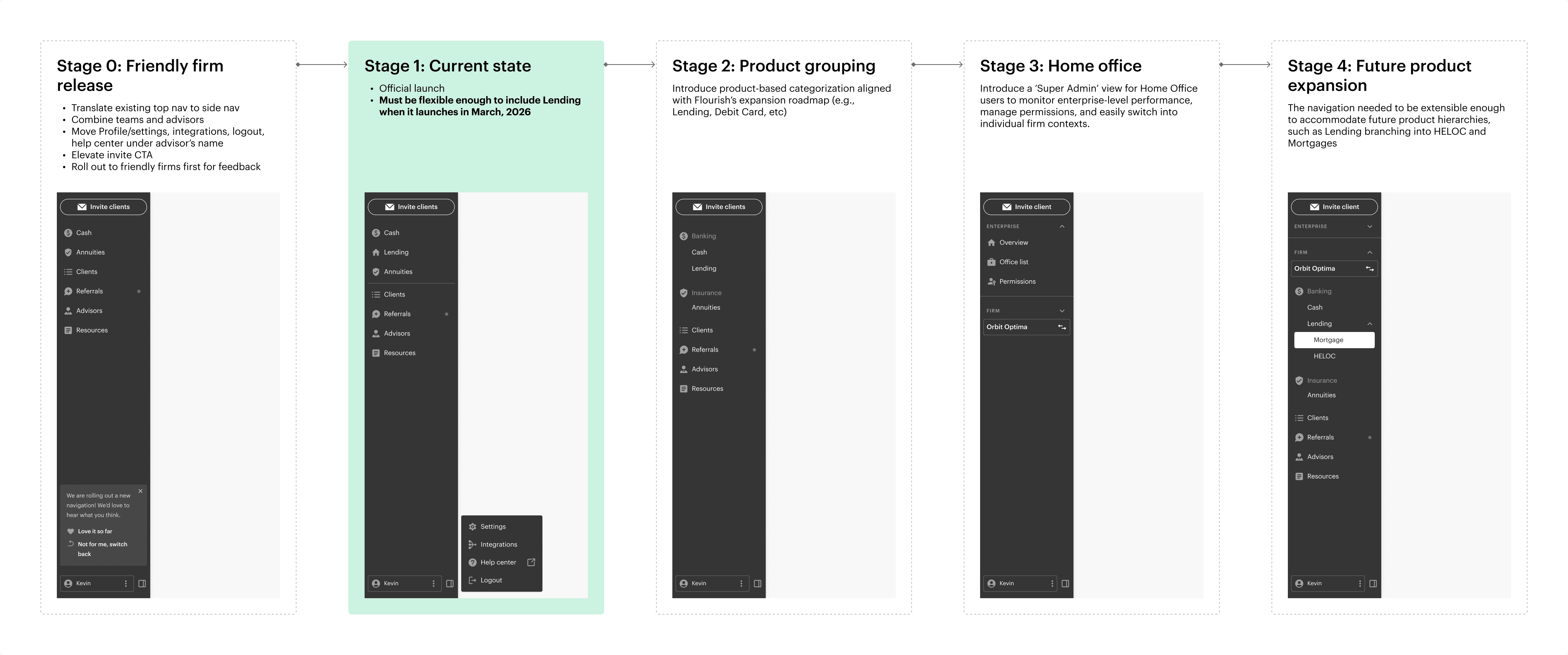 For years, Flourish’s advisor platform relied on a top navigation built for a single product (Cash) and smaller firms. As the platform expanded—adding Lending, supporting a new Home Office firm model (onboarding 'whale firms' that manage numerous 'child' firms), and introducing a 'Super Admin' role that could switch across firms—the horizontal nav no longer scaled.